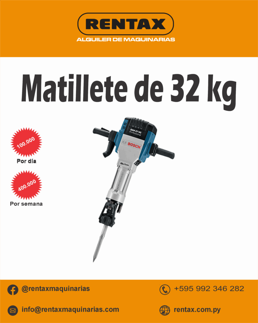 Alquiler de Martillete de 32 kg, potencia absorbida: 2.000 W, energía de percusión: 62 J, peso: 32 kg. Diseñado para picar y romper hormigón de hasta 20 cm de grosor con un único modo operativo de alta precisión. Su diseño ergonómico con empuñadura antideslizante y sistema de reducción de vibraciones garantiza comodidad y control en usos prolongados. Construcción robusta con materiales de alta resistencia para una larga vida útil en los trabajos más exigentes. Incluye sistema de cambio rápido de cinceles, interruptor de bloqueo de seguridad y protección contra sobrecargas para un rendimiento confiable.
